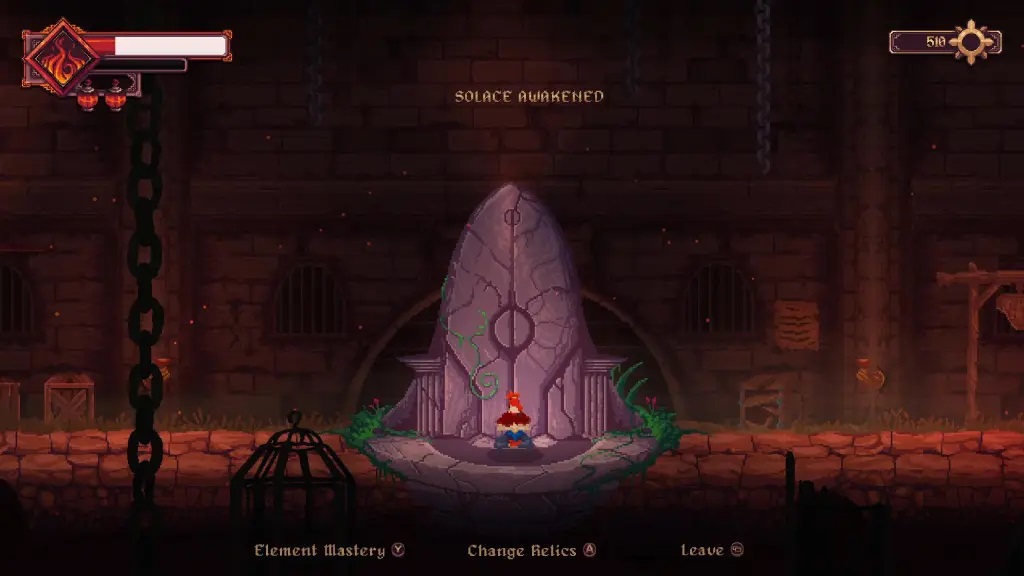 28、通过试炼后继续前进,在下一个房间中就会遇到游戏里的第一个【慰藉点】;这就是【沙漠慰藉】,同时它也是你的存档点,可以在这里提升元素精通并装备新的遗物;