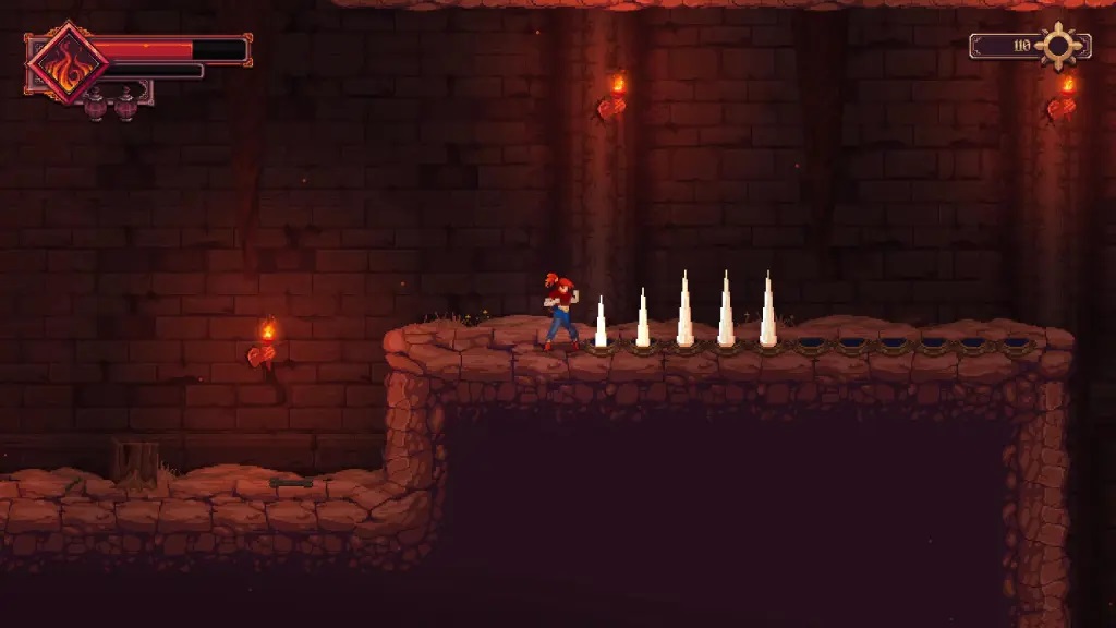 14、继续前进,使用【火球术】点燃另一侧的祭坛,触发浮空平台出现,再借助平台越过尖刺陷阱;