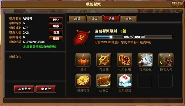 2、击杀帮会BOSS活动:当玩家所在帮会等级达到4级或者以上,帮主可以每周设置两个时间段来开启这一活动,该活动类似击杀BOSS,所有当前帮会成员都可以在这一时间段进行击杀,并在击杀过程中获得一定丰富的奖励。