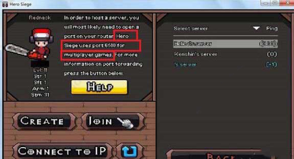 3、创建选择角色后,来到这个界面,主意红色区域,意思是:HeroSiege联机时使用6510端口