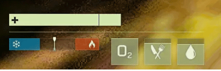在探索的时候需要注意角色的状态,在屏幕左下角可以看到。上面的是血条,下方左边为温度,右边的三个分别代表氧气值、饥饿值和水分,需要重点关注,随时补充。