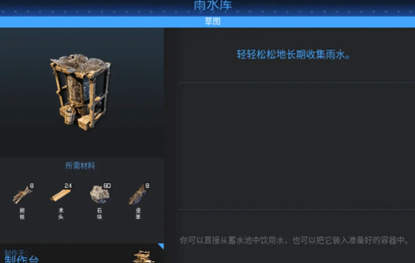 水可以到湖边喝,但一直喝湖水有可能会出现负面效果(毕竟是不干净的水)。如果需要在森林中探索,远离水源,可以制造容器储水,在容器内的水也可以用于烹饪。在后期解锁雨水库后,可以采集雨水、冰。
