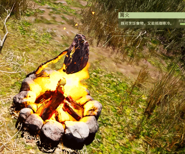 第一个白天除了斧头、石镐、弓箭、刀等必备工具外,一定要记得做出篝火,这样到晚上才不会伸手不见五指。篝火能取暖、烹饪食物、照明,是前期非常重要的东西。