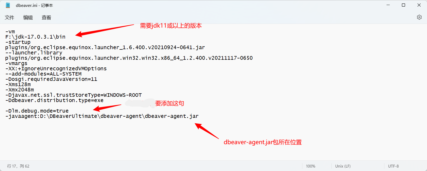 2、修改dbeaver.ini文件,配置11以上版本的jdk(如果已经配置在环境变量上,则不用),添加dbeaver-agent.jar所在路径,该版本需要添加 -Dlm.debug.mode=true