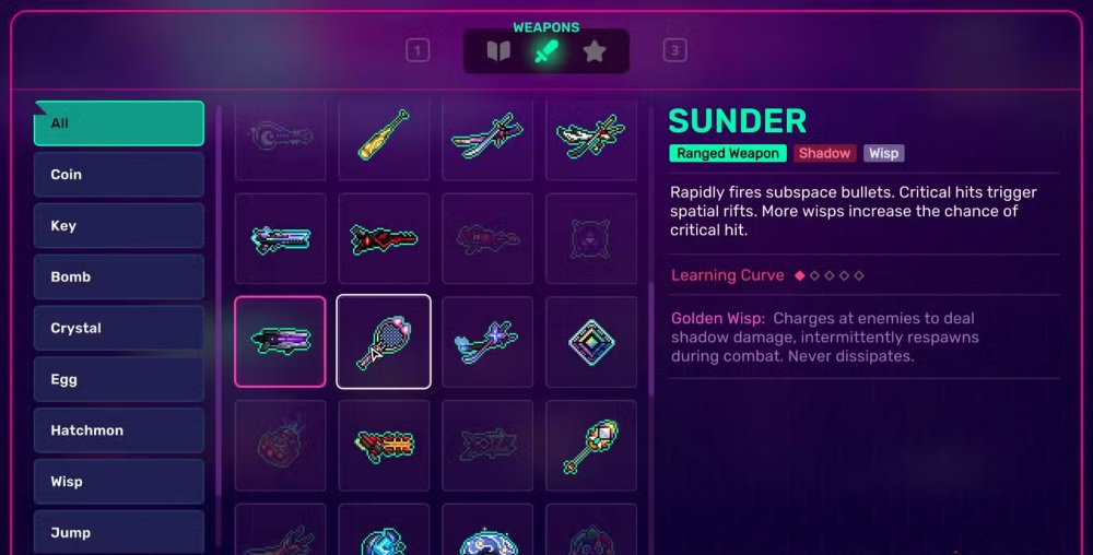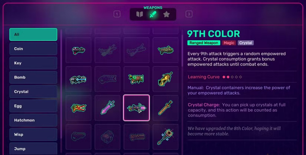 特点:每发射九颗子弹,你将触发一个强力的增效攻击,如彩虹光束或追踪子弹。由于其较快的射速,你能够很快触发增效攻击,提供稳定的输出。使用水晶时,你的攻击会进一步增强,适合在Boss战或挑战房间时提前准备。它还允许你即便水晶满了已满,也还能拾取。