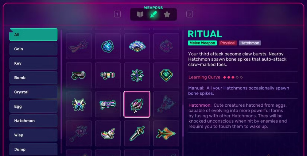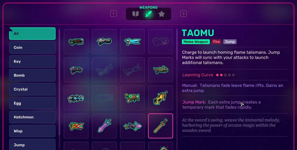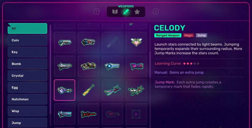 特点:Celody是一款极具特色的武器,持久充能后会生成星星并连接起来,增加额外的跳跃能力。它的旋转星星能造成大量接触伤害,并且通过跳跃可以扩大攻击范围,使其成为一款强力的近战武器。同时,Celody的星星阵列也可以发射出去,进行远程攻击,具有无限射程,是一个在Boss战中极为强大的选择。