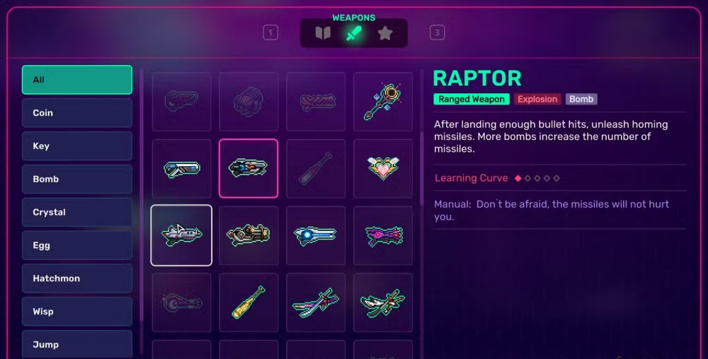 特点:Raptor具有较高的射速,适合快速清理房间。它的独特能力是在发射几次后释放追踪导弹,帮助你轻松击败烦人的敌人和Boss。你拥有的炸弹越多,释放的导弹也越多。