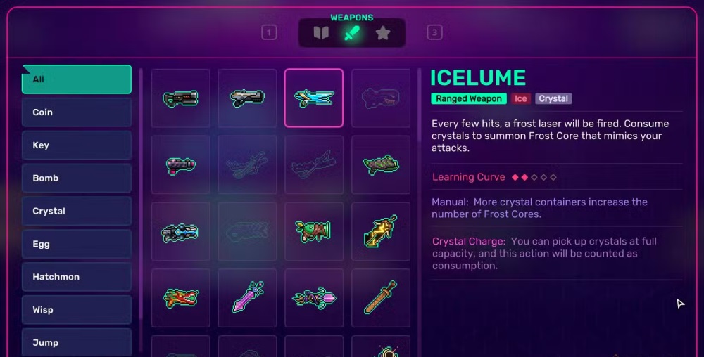 特点:每几次击中敌人,Icelume都会自动发射强力冰冻激光。当你消耗水晶时,激光会变成冰霜核心,模仿你的攻击。多个冰霜核心能同时造成伤害,在面对大群敌人时效果尤为显著,特别是在Boss战中,其宽阔的战斗场地为激光提供了清晰的攻击路线。
