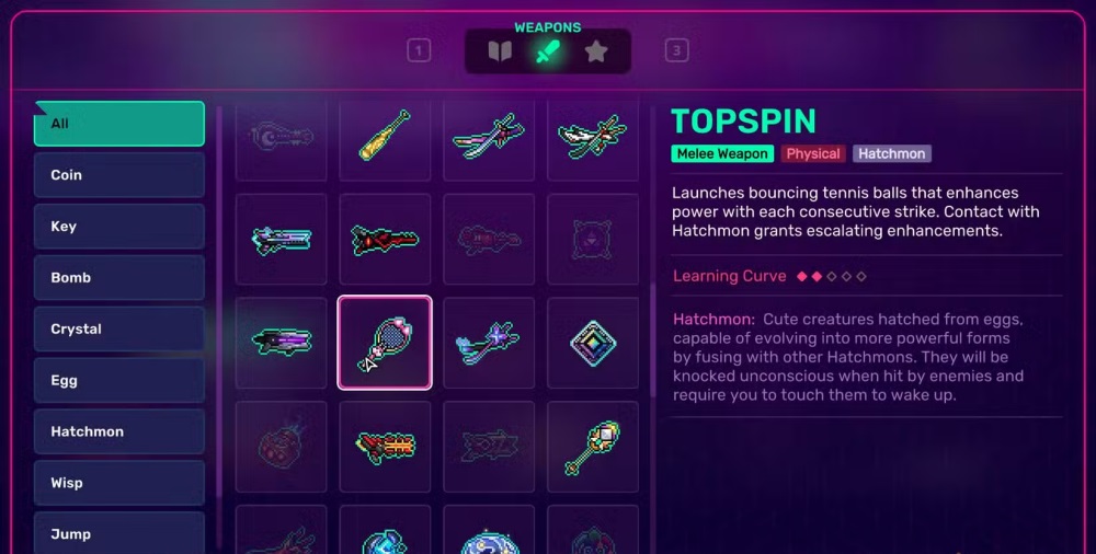 特点:Topspin是一款极为强力的武器。每击中一次生成的网球,都会增加速度、尺寸和伤害,且可通过Hatchmon的反弹来强化伤害。与“阿卡比信仰”及“可爱的支持命运卡”配合,能使你轻松获得大量Hatchmon,让你轻松摧毁敌人和Boss。