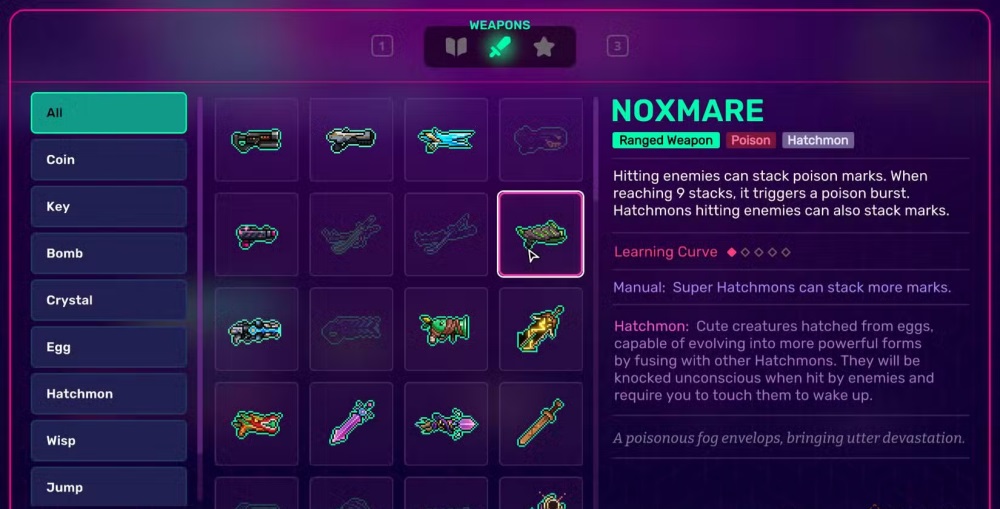 特点:Noxmare是一款强力的中毒武器,能够对敌人造成持续伤害。每当中毒堆叠到九层时,毒性会引爆,造成巨额伤害。然它不像其他孵化宝贝类型武器那样直接获得孵化宝贝或蛋的加成,但它能让你的孵化宝贝的攻击叠加毒素。