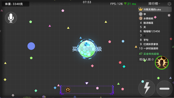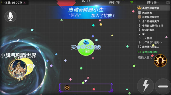 1、对局为50人同屏的无限复活乱斗,全程9分钟快节奏对战,玩家以体重为核心目标争夺排行榜名次。