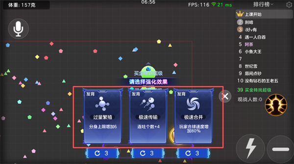 2、对局内会随机刷新强化效果选择,可从过量繁殖、极速传输、极速合并等发育类效果中,自由构筑专属成长路线。