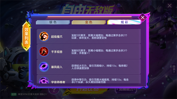 3、玩法内置超35款特色技能,其中炫彩级技能包含超级魔爪、千手观音、暴风吸入、宇宙吞噬者等强力效果,可随心组合搭配。