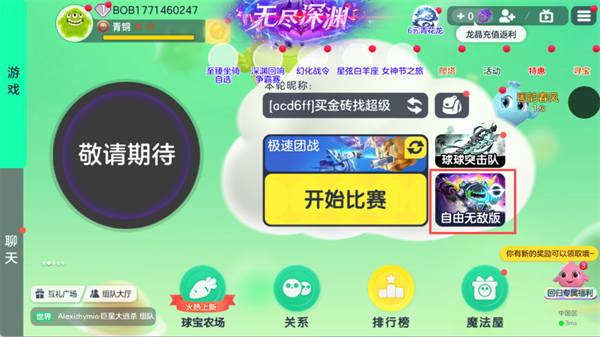 1、在游戏主界面,点击右侧红框标注的「自由无敌版」入口,即可进入该玩法专属页面。