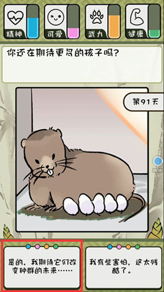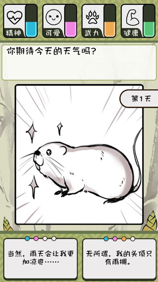 游戏的核心是通过选择不同的选项来影响竹鼠的四个属性:精神、可爱、武力和健康。每个属性都有各自的上限和下限,一旦达到极值就会导致游戏失败。玩家需要在各种突发事件中做出合理的选择,帮助竹鼠活下去并解锁各种成就。