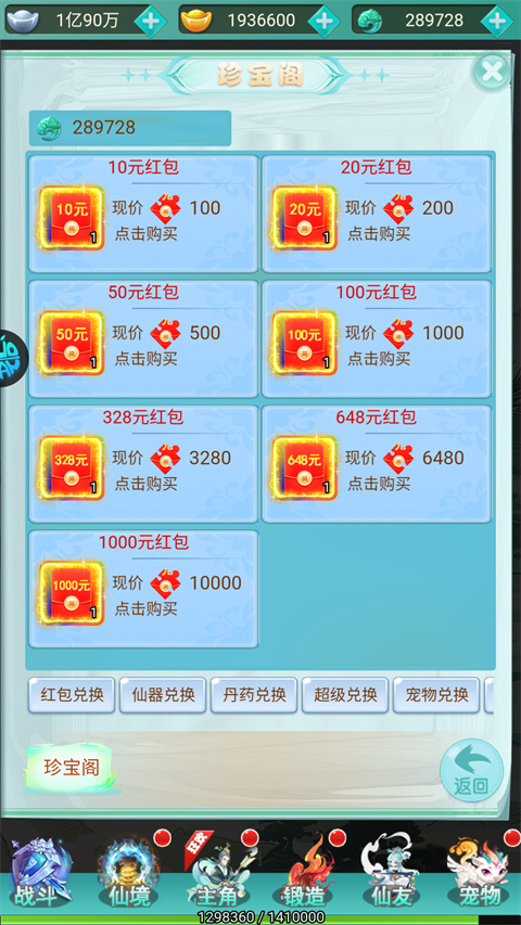 3、珍宝阁超级兑换每日可兑换海量元宝