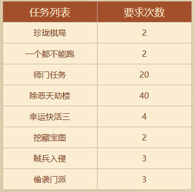 ②为了节省跑图的时间,少侠可以先完成【一个不能跑】5次,再完成【除害】5次,最后完成【剿匪】5次
