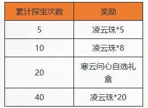 活动期间,少侠可花费元宝购买【凌云宝匣】,购买使用后可获得“凌云珠”和“探宝符”。