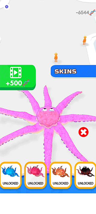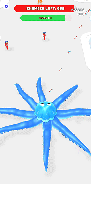 游戏中还能给章鱼换皮肤,变得更炫酷。任务丰富,每个关卡都有不同的挑战,射击方式也很独特,解锁各种战斗力。新手的话,先下载游戏,进入首页后点击按钮增加触手的血量、大小、进食量或触手数量,再换皮肤,开始游戏用摇杆控制移动和攻击就行。