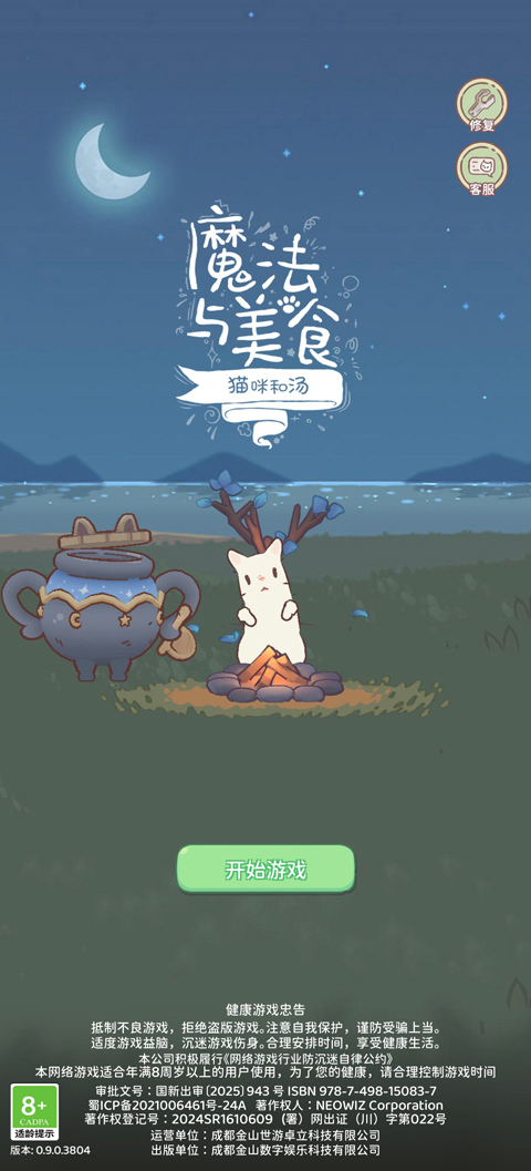 1、打开猫咪和汤魔法与美食手游,手机号获取验证码注册登录,点击开始游戏;