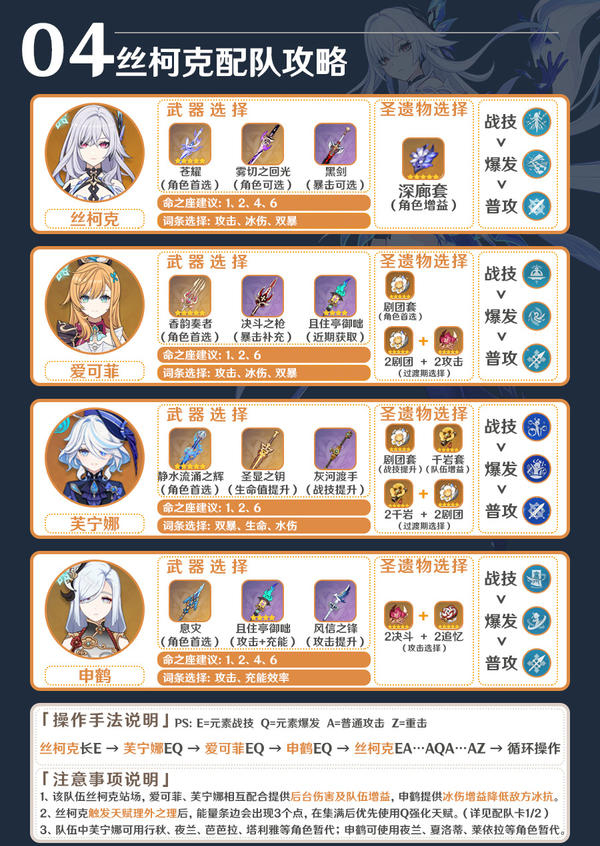 圣遗物方面,深廊终曲4件套是毕业套装,特别适合丝柯克的机制。配队方面最好绑定水+冰双元素,主流组合有高金顶配队和低金性价比队,平民玩家可以考虑过渡队。命之座方面,0命性价比最高,1命提升明显,2命解锁速切玩法,6命则是全方位提升了。