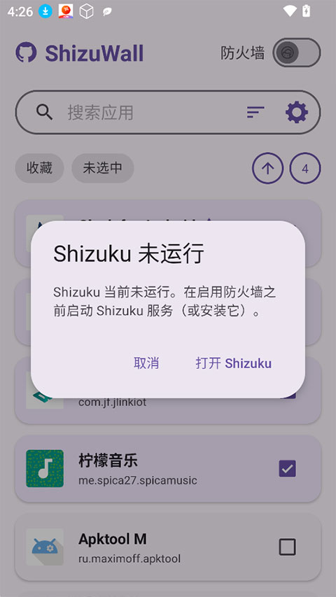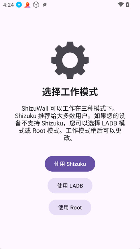 1、使用ShizuWall首先要激活Shizuku,激活Shizuku即可在ShizuWall中选择Shizuku模式进行使用