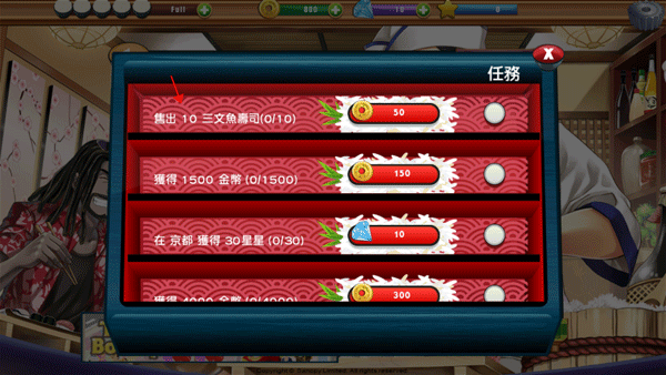 2、游戏有很多地点关卡,每个关卡对应的食物都是不一样的,第一关是在京都。
