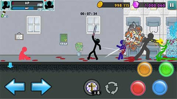4、在本作中,一开始你可以选择九个不同的火柴人角色开始战斗,单人闯关模式和团队战斗两大模式任你选择,丰富的火柴人角色绝对拥有让人目不暇接的视觉感受;