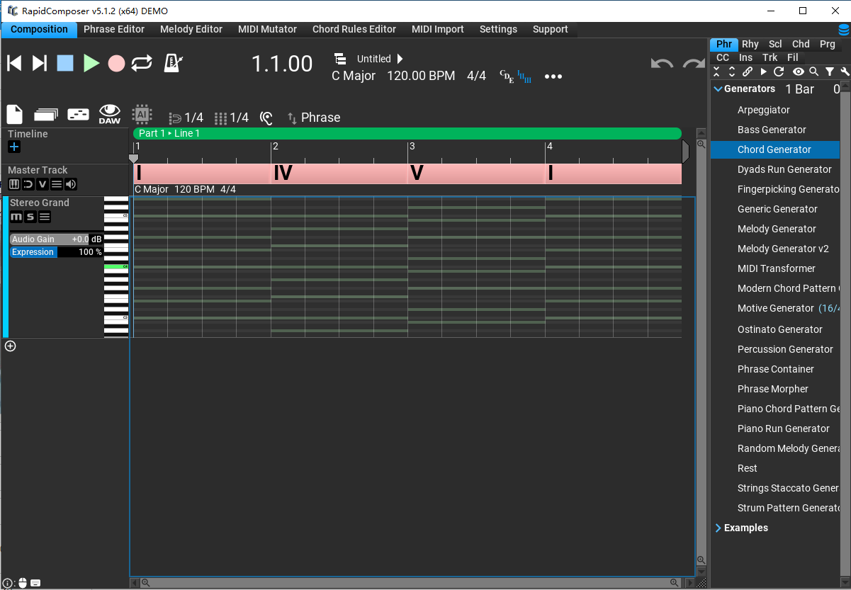 6、包括的乐句生成器:琶音器,低音生成器,和弦生成器,Dyads Run,生成器,FingERPicking生成器,Generic生成器,乐句容器,Piano Run生成器,Strings Staccato生成器,Piano Chord Pattern生成器,Strum Pattern生成器,仅在完整版中:Melody发生器,随机旋律发生器,短语变体