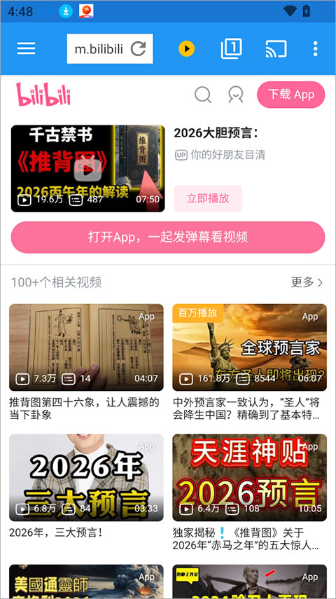 在 App 自带的地址栏输入视频网站链接。播放视频时,App 会自动弹出发现的视频资源列表(通常会列出分辨率和文件大小)。