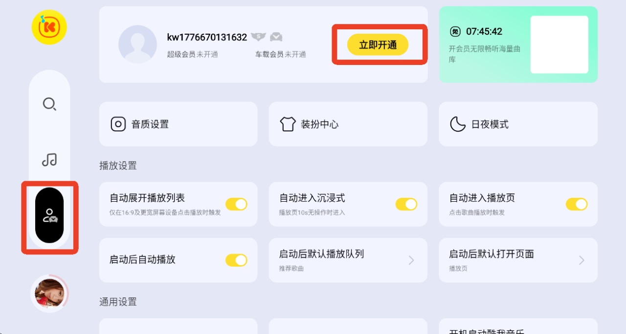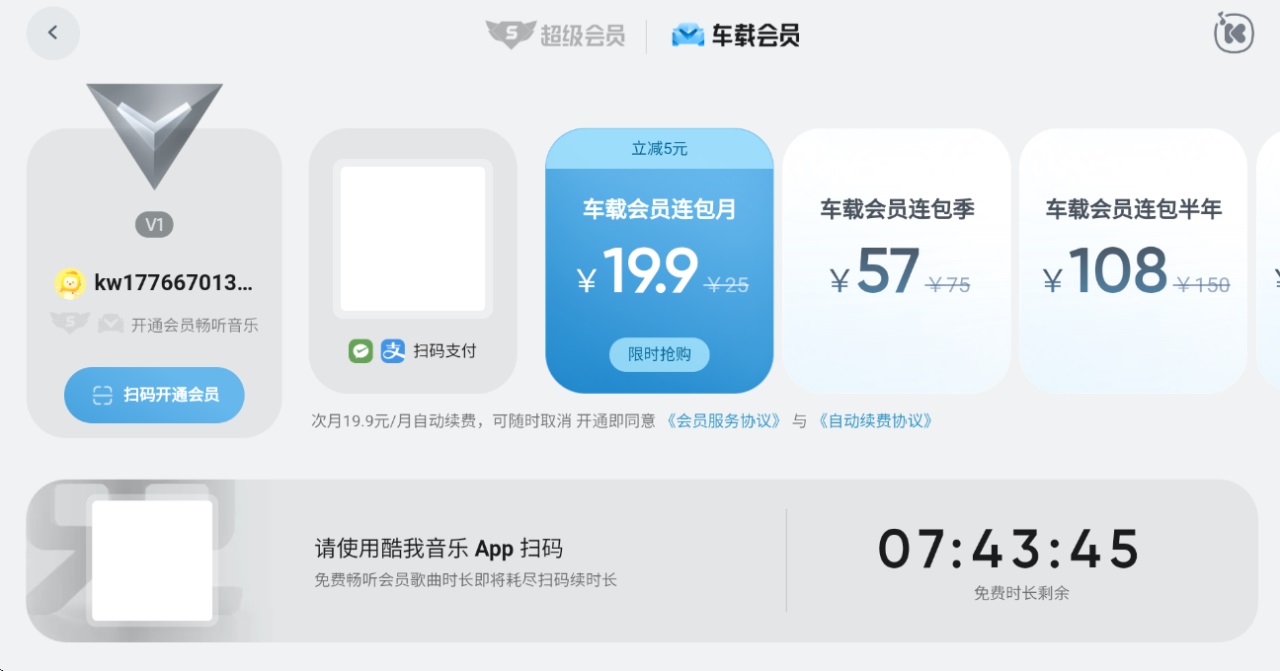 2)您可核对一下手机端开通的会员账号和车载端登录的会员账号是否一致,建议您在“酷我音乐车载版--我的"或“酷我音乐app-我的--会员中心"查看。如登录的是不同账号,重新使用酷我登录即可;