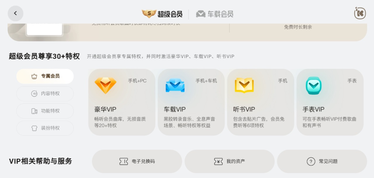 ① 如果你主要在车内听歌,可以选择【车载会员】,价格比超级会员低。
