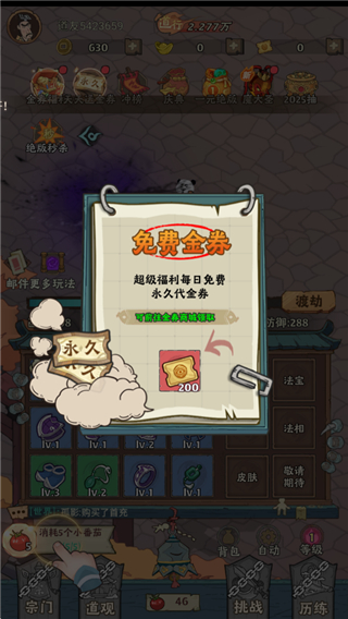 《苍穹灵宝》是一款以道士职业为背景的修仙手游,玩家扮演道长,在诡异的修仙世界里捉鬼驱魔。游戏通过点击铃铛自动攻击僵尸,获得宝箱随机开出装备,装备品质与轱辘等级有关,升级后能提高高品质装备掉落概率。渡劫是提升角色上限的重要玩法,完成任务即可解锁。