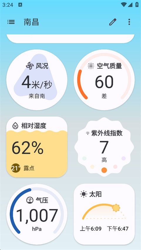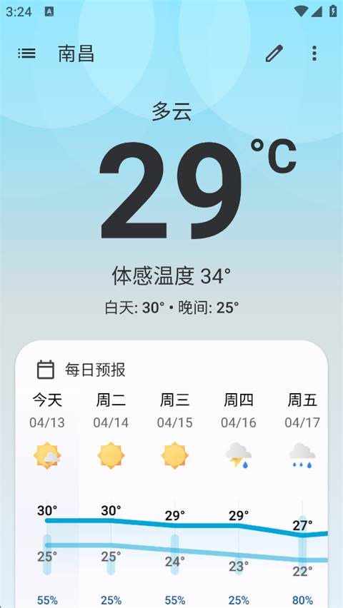 如果你比较着的想了解当下的实时天气那么也可以通过Breezy Weather天气预报软件进行了解,你可以知道温度、湿度、风速、降水概率等数据,让你对今天的天气有一个准克制的了解。