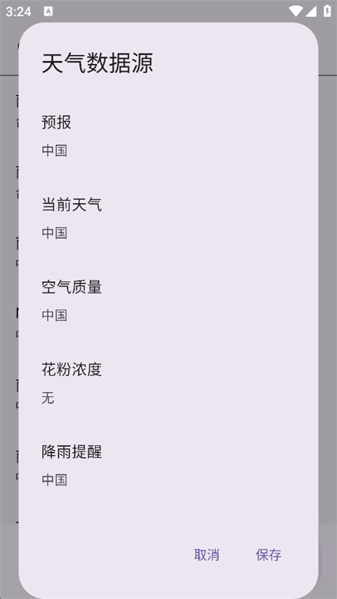 花粉浓度:可根据需求开启对应数据源(当前为「无」,可按需选择)