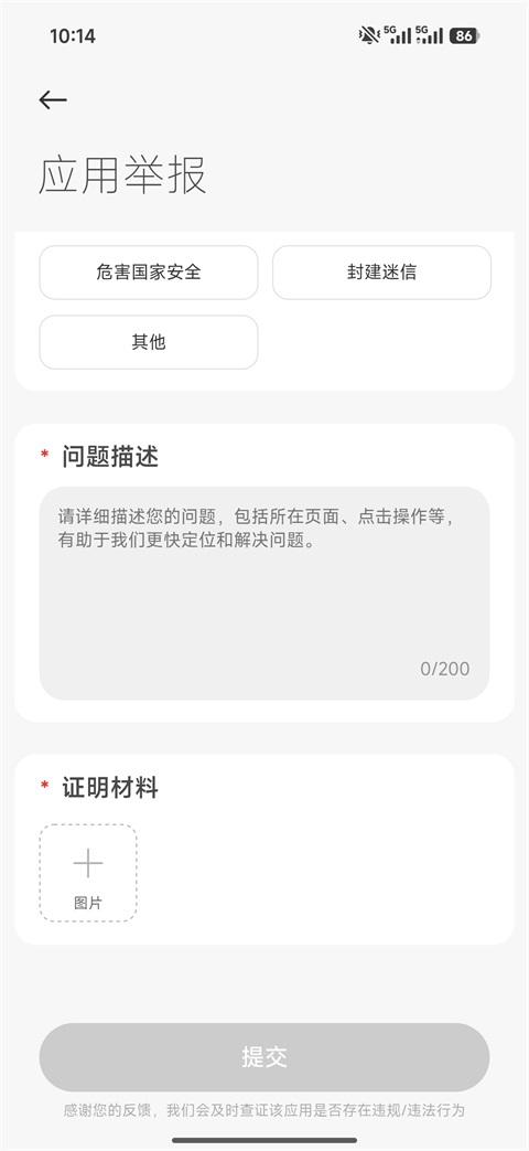 5、填写问题描述,还可以上传截图或证明材料;
