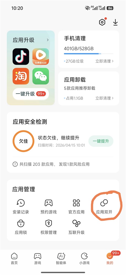 2、找到底部的【应用双开】,点击进去;