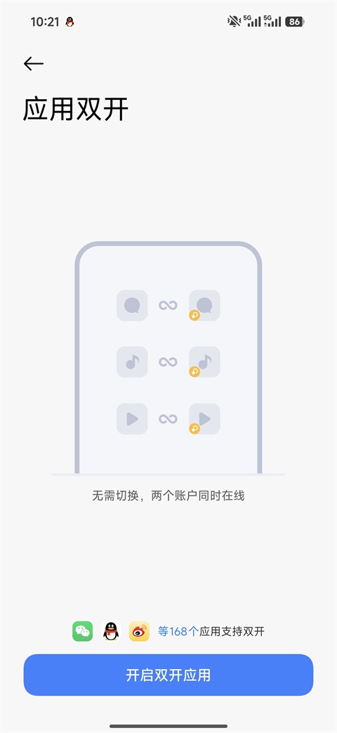 4、进入应用双开功能后,你可以看到支持哪些应用双开,会智能为你推荐双开应用;