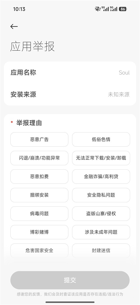 4、选择举报理由,(如“恶意广告”“恶意扣费”“低俗色情”等);