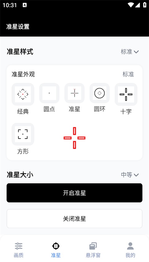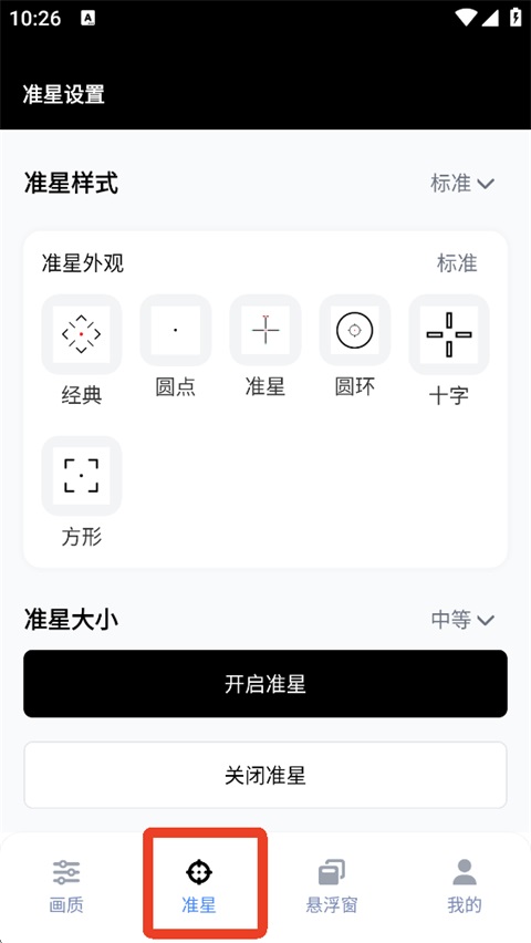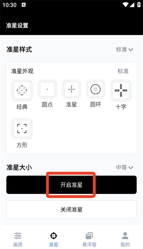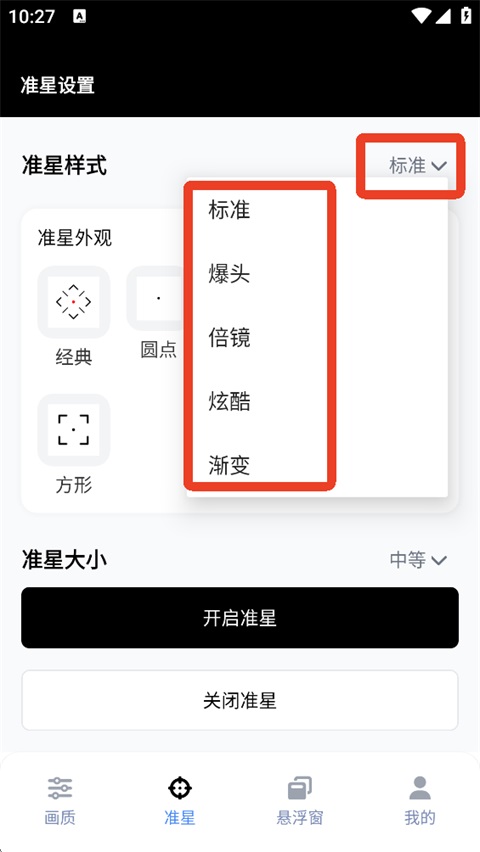 2、点击右上角的【标准】按钮,可以切换不同的准星类型。