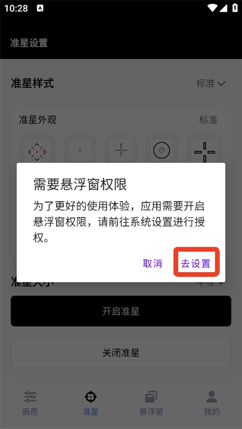 3、选择你喜欢的准星形状后,在设置之前需要开启悬浮窗权限,点击【去设置】进行权限设置。