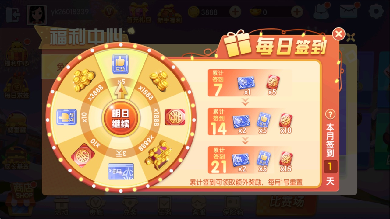每天登录游戏可通过转盘随机获得奖励,累计达到规定的天数还有额外的奖励领取。