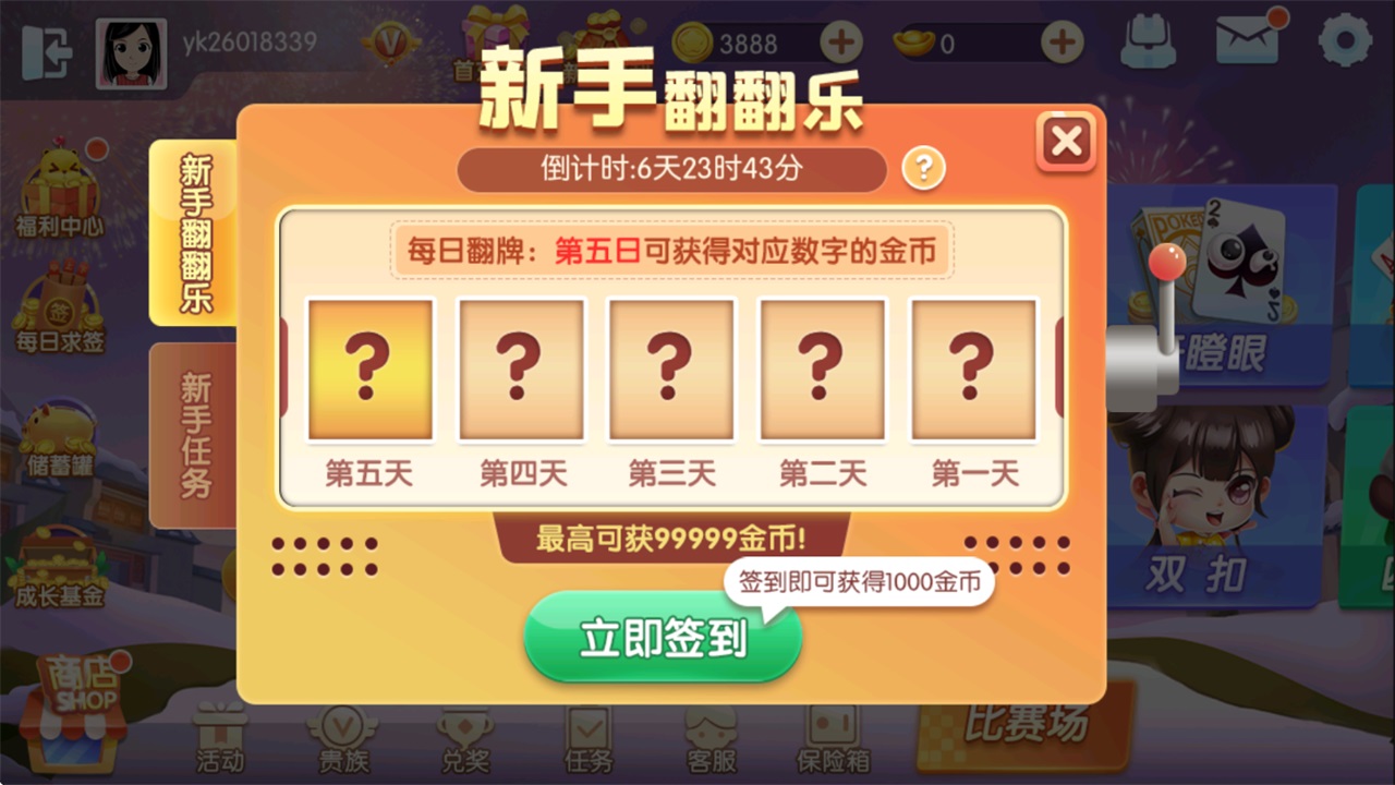新手玩家每日上线点击签到即可获得金币奖励,并翻开一张数字牌,累计翻牌五次可以获得对应数字的金币。