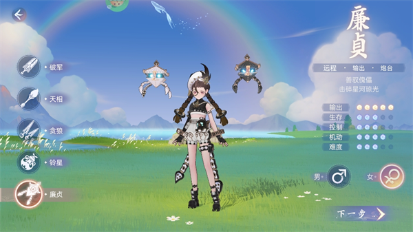廉贞,操控阴阳双傀,可召唤傀儡远程输出和吸引仇恨,总体是一个控制输出抗伤都比较全面的全程射手,在部分技能效果下,两个傀儡还可以组合成巨大的千机火铳进行手持攻击。