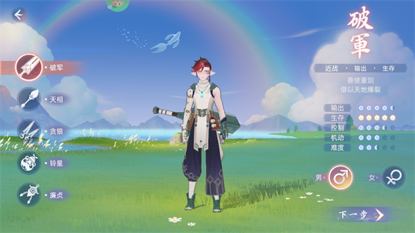 游戏中一共有破军、天相、贪狼、铃星、廉贞5个职业10个角色形象,分别对应了战士、法师、刺客、辅助、射手。每个职业有3个专精,代表不同的发展和技能效果。