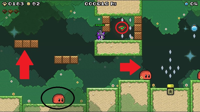 1、玩家可通过踩着红色史莱姆跳跃到较高的方块上(注意:红色史莱姆连跳两次就会被消灭);