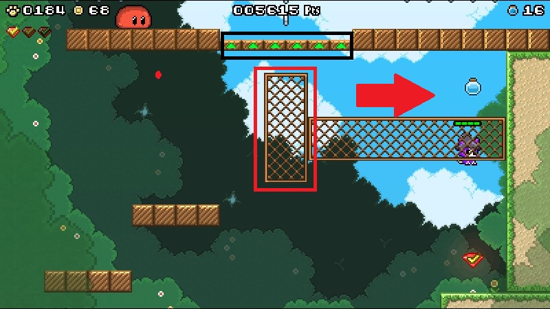 然后回到最左边的方块台阶跳到网格处向上攀爬,带绿色三角符号的台阶是可以直接向上跳跃穿过,并且可以踩着不会跳下来;