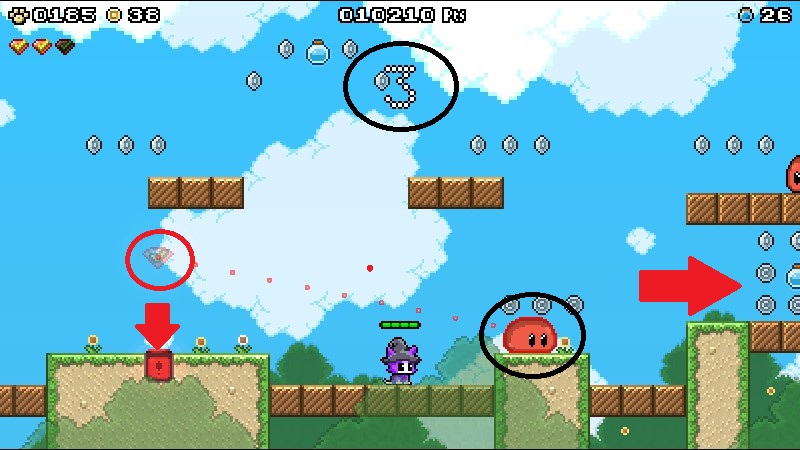 一个关卡中需要集齐三颗宝石,玩家返回跳下来,往右继续前行;