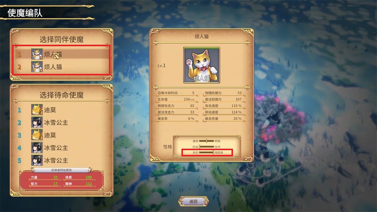 2、选择两位同伴使魔"烦人猫"(迷宫无尽模式的51层出现可进行抓捕,必须是抓捕黄色的烦人猫),然后将性格第三条"怕孤单"拉满,这样两只猫敲法阵时就不会隔太远;