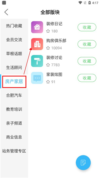 2、在板块界面选中“房产家居”,然后选择“购房俱乐部”。